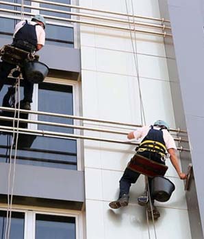 При выезде на место специалист проводит осмотр объекта, выполняется ограждение территории, разведение составов для очистки фасада, проверка снаряжения для промышленных альпинистов.